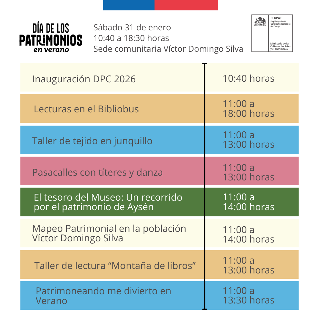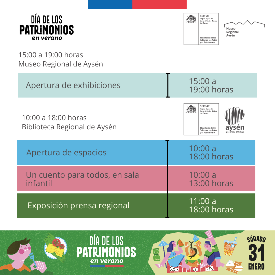 La puesta en valor del patrimonio cultural es central entre las actividades que se desarrollarán durante esta jornada. De esta manera, los participantes podrán disfrutar de talleres prácticos de hilado, mimbre, junquillo y alfarería, muestras de patrimonio culinario, cuenta cuentos y shows de títeres, presentaciones de circo y pasacalles, junto con talleres de lectura y revisión de la memoria histórica regional, presente en la prensa de Aysén, entre otras actividades.